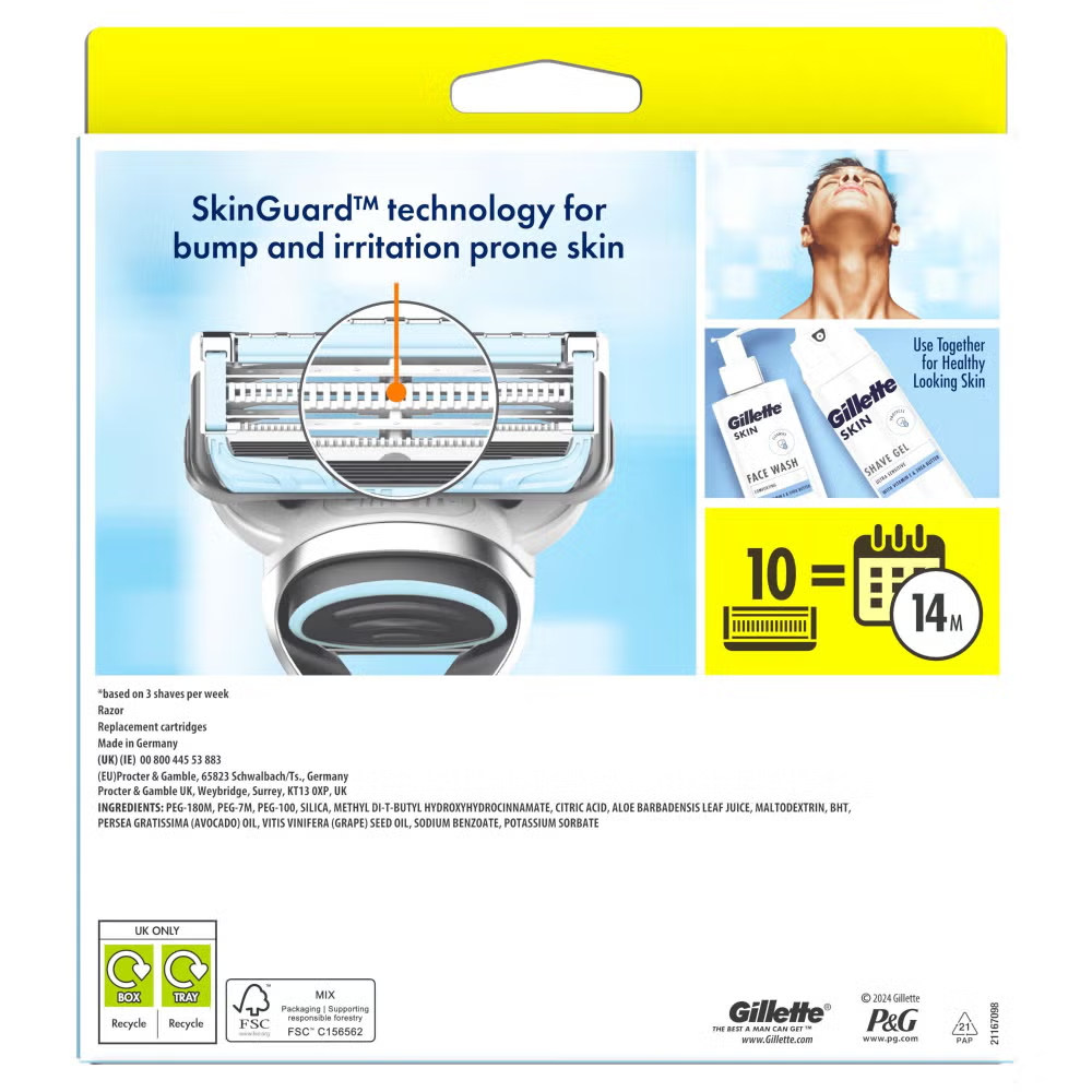 This value pack contains a SkinGuard Sensitive razor in sustainable packaging along with 10 cartridges. The Gillette SkinGuard Sensitive razor is specially designed and clinically proven for sensitive skin. With one SkinGuard Sensitive cartridge, you can expect up to 20 comfortable shaves.