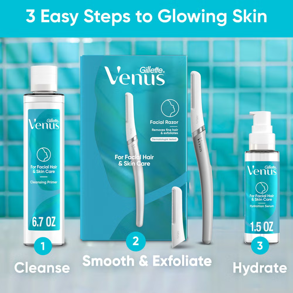 This is the best dermaplaning kit for beginners to facial hair removal to opt for from Gillette Venus if they want the dermaplaning essentials that allow novices to get started immediately. The Gillette Venus facial essential shaving kit includes our dermaplaning razor handle, five blades which can be fitted with ease plus our facial cleansing primer, a product that’s been specifically designed to help newcomers to the world of dermaplaning.