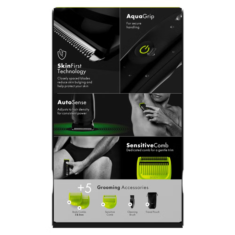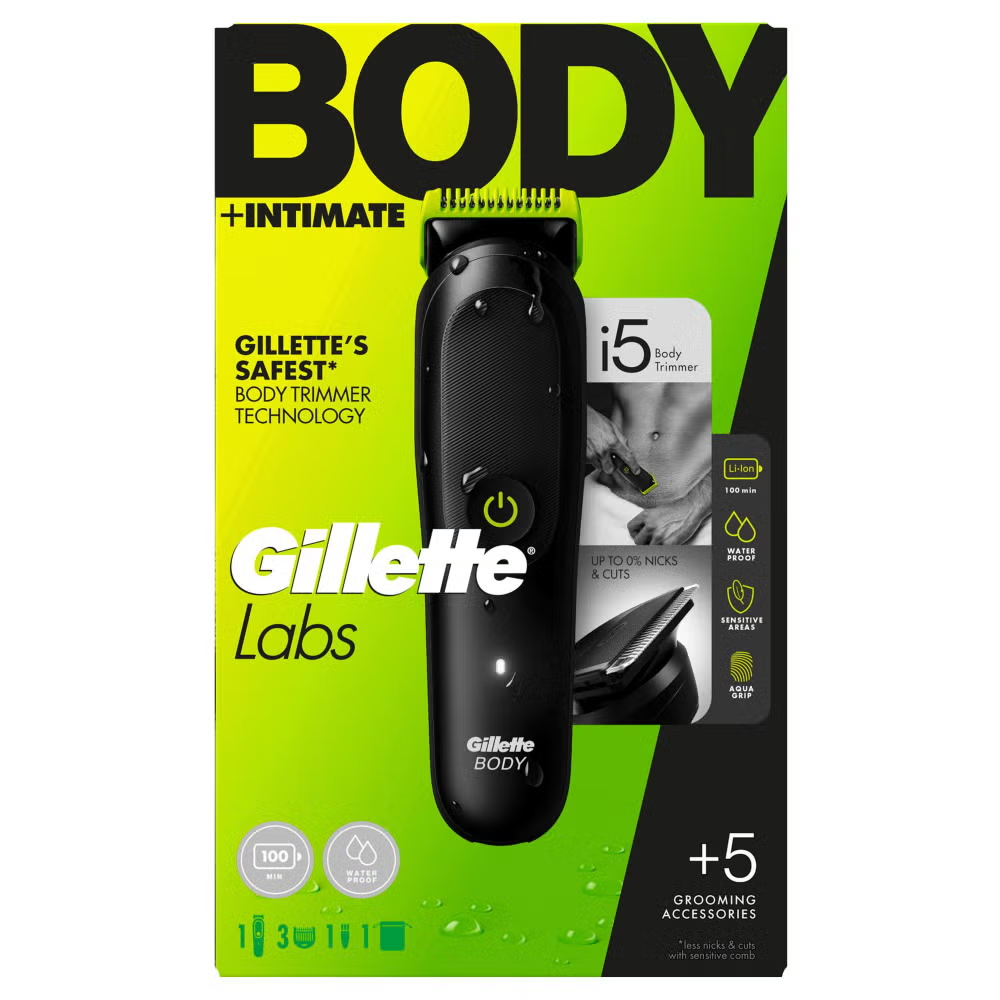 Introducing the GilletteLabs i5 Body + Intimate Hair Trimmer, the definitive body groomer for men. Designed with SkinFirst cutting technology for up to 0% nicks and cuts, providing Gillette’s safest* body trimmer technology – perfect for sensitive areas, making it an ideal groin trimmer for men. Autosense technology that adapts power to hair density for consistent power and effortless results. Easy to control with AquaGrip – a textured, water‑resistant handle that prevents slipping and improves precision for hard‑to‑reach and sensitive areas, while the compact design allows for precise handling across all body areas, including hard-to-reach places. Long-lasting blades, a waterproof design, and a powerful lithium-ion battery (100-minute run time) combine to deliver unstoppable performance. This kit includes everything needed for body hair trimming: Three body combs (3mm, 5mm, and sensitive), storage pouch, and cleaning brush, making this men’s body hair trimmer a great choice for body hair trimmers for men. (*less nicks and cuts with sensitive comb)