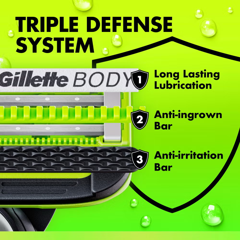Elevate your body grooming experience with GilletteLabs Body + Intimate Razor Blade Refill Cartridges, designed for GilletteLabs’ safest* body shave. Each refill is engineered with our innovative Triple Defence System, featuring a long-lasting lubrastrip for a smooth glide, an anti-ingrown bar to help prevent ingrowns, and an anti-irritation bar to help release trapped hairs. This comprehensive system helps protect against regrowth itch and shave irritation, ensuring a comfortable and smooth body shave every time. Gillette’s long-lasting premium blades are precisely crafted and widely spaced for easy rinsing, preventing clogging and maintaining hygiene. The precision trimmer allows optimal reach even in tricky areas. These refill cartridges are designed to work with your GilletteLabs Body + Intimate Razor. Give your body grooming routine the attention it deserves with the purposefully designed GilletteLabs Body + Intimate Razor Cartridges. (*less nicks and cuts)