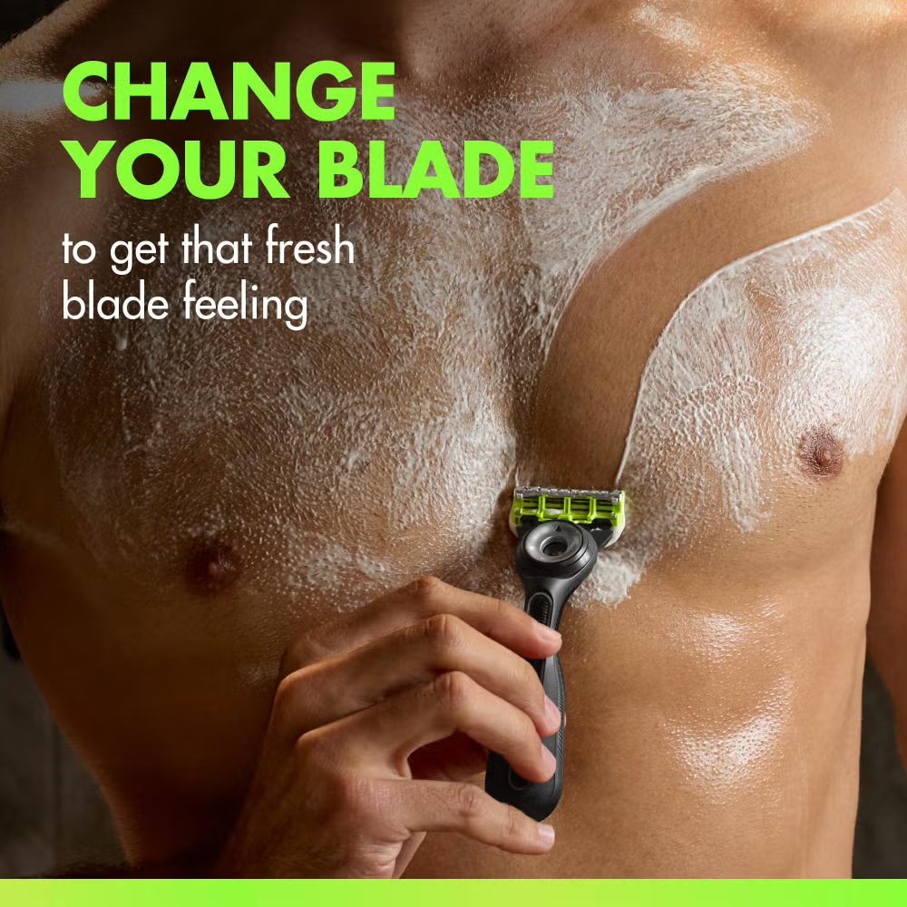 Close up of GilletteLabs Body Razor cartridge with text about changing your blade.