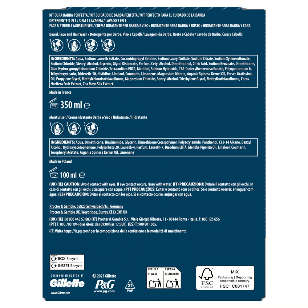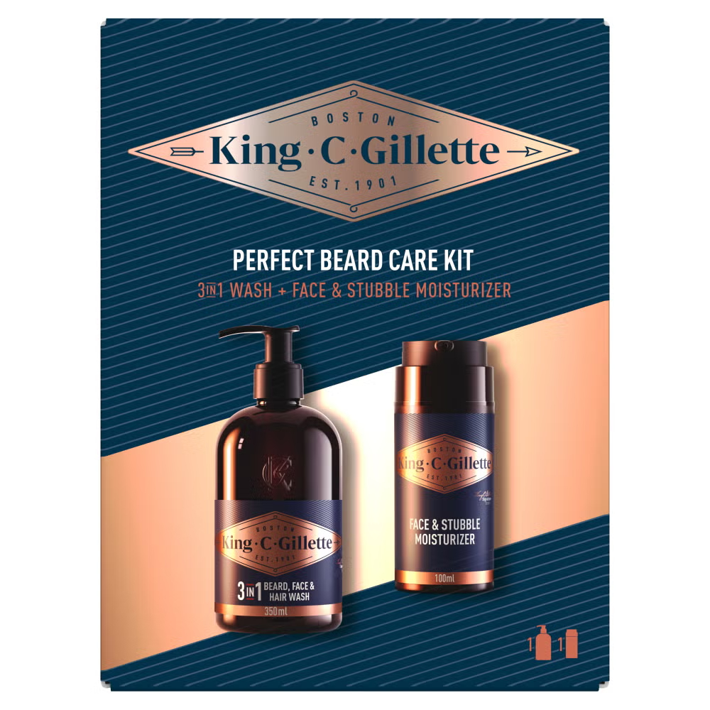 King C. Gillette Perfect Ritual Kit contains our 3-in-1 Beard, Face and Hair Wash (350 ml) as well as our Face and Stubble Moisturiser (100 ml) in a single, handy kit. Ideal for your daily ritual of cleansing and maintaining your facial hair, the products in the kit can be used to cleanse, hydrate and refresh your beard as well as helping to preserve the skin’s natural moisture barrier. As a part of our wider beard care range, this particular combination of beard care products will mean your facial hair always looks at its best even if it has been a while since you last trimmed it.