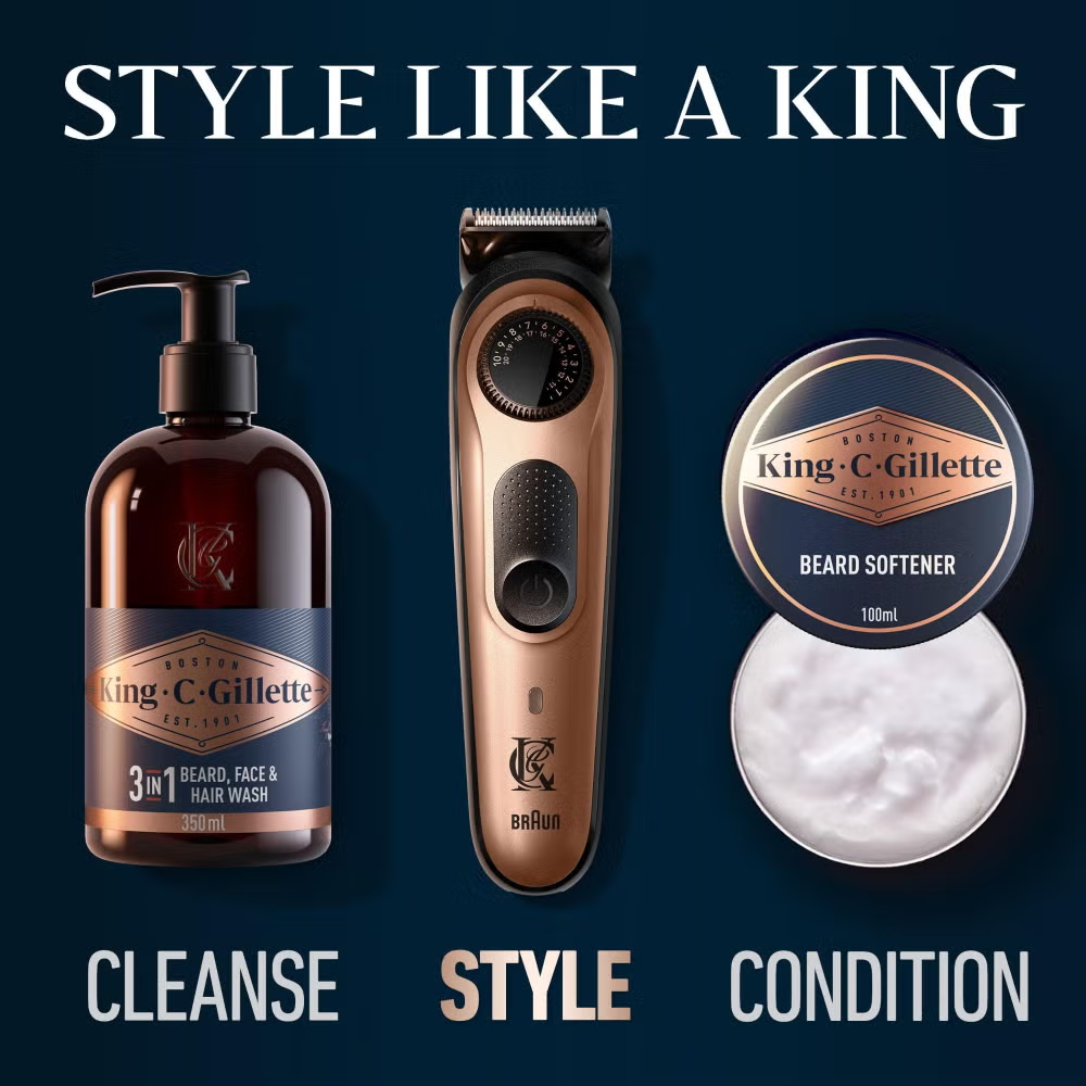 Keep your beard trimmed, well-groomed and wonderfully nourished with the King C. Gillette Beard Trimmer & Beard Care Kit.